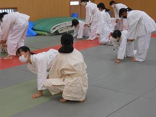 1年生は柔道と創作ダンスを入れ替えて取り組んでいます。今日の1限目は寒い中、1組が創作ダンス、2組は柔道でした。1組のダンスは今日が発表会、6グループがステージで発表していました。2組の柔道は「横受け身をマスターしよう」を課題に、受け身の際の手・足の位置を確認していました。