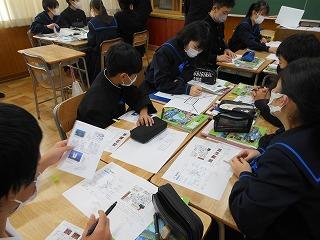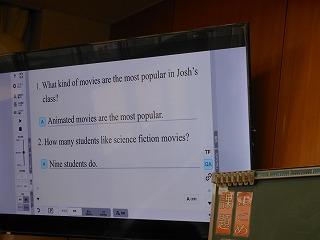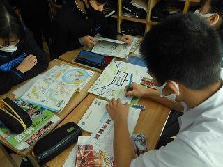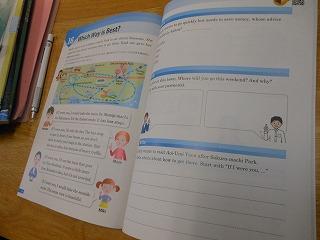 2・3年生の英語では、文部科学省から発行されている補助教材「Bridge」も利用しながら授業を組み立てています。今日は「16 Which Way is Best?」をテーマに、どの路線で行くと短時間で目的地に到着できるか話し合っていました。