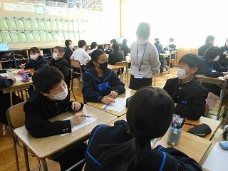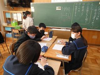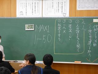 本校では、学級づくり・学年づくりの一環として、エンカウンターの活動に定期的に取り組んでいます。昨日も1年2組で級外の廣瀬先生が「二者択一」と「MAX50」の活動を行いました。活動中に自然に拍手が起こったり、二者択一の理由説明に「へぇ~」や「なるほどねぇ~」との感想が聞こえていました。