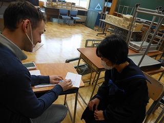 英語科では授業時間を利用して、ALTのジョナサン先生とともに、パフォーマンステストを行っています。1年生は絵を見て状況を説明することとジョナサン先生とのフリートークです。緊張した面持ちでテストに臨む1年生です。