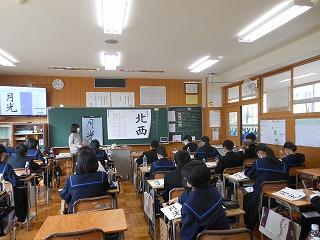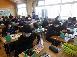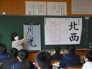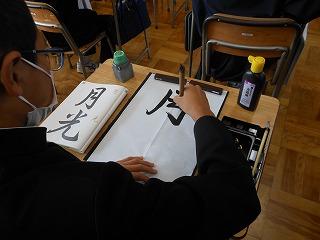 国語科では、年間数時間、硬筆・毛筆の書写の授業を行っています。1・2年生は毛筆で教科書に例のある課題に取り組んでいます。1年生は「北西」と「月光」。2年生は「紅花」と「豊かな心」です。生徒たちは姿勢正しく、お手本を見ながら、行書の毛筆に挑戦しています。