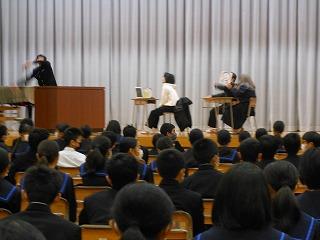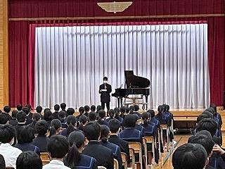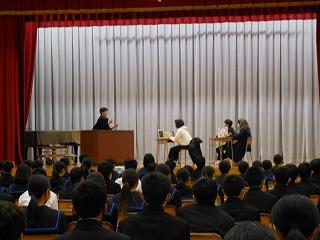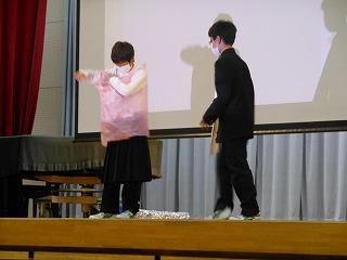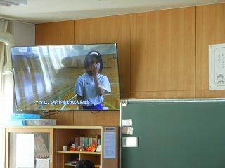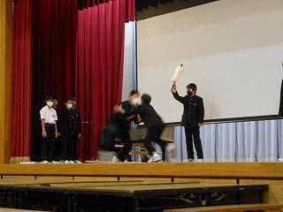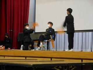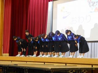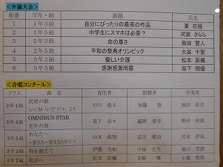 各学年の発表に続いて、有志によるステージ発表と吹奏楽部演奏でした。有志は2組、1組目は3年生4人組、素敵な歌声を体育館に響かせました。2組目は先生方4人組の先生クイズ。先生方のいろいろな面を知ることができました。全校が教室に戻り、最後は吹奏楽部が録画した演奏3曲をモニタで視聴しました。