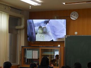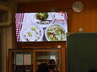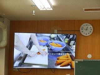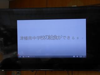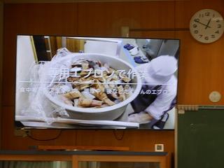 給食委員会では「調理員の1日」という動画を作成し、今日の給食時間に各教室で放送しました。材料を切ったり、混ぜ合わせたり、片づけの様子が字幕とともに紹介されました。