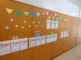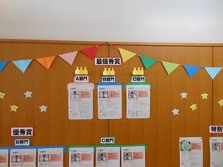 昨日の給食にも出された献立コンクールの優秀作品。家庭室前にはメニューカードとともに、優秀者の表彰コーナーが設けられました。