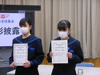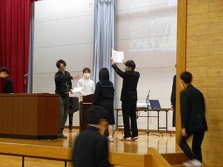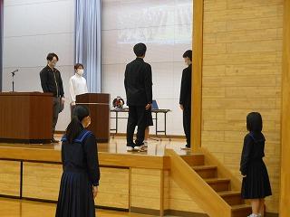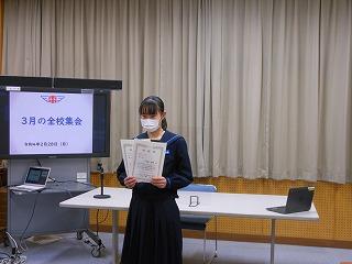 明日から3年生が臨時休校となるため、今日の1限目に3月の全校集会を実施しました。表彰披露では、3年生の小テスト(漢字・英単語)の1年間満点者・3年間満点者の表彰も行われました。