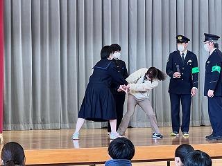 不審者に出会ったときは「いかのおすし」を心がけることや、手を引っ張られた時や後ろから抱え込まれた時の脱出方法について教えていただきました。