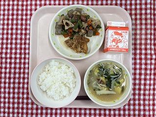今月のご当地献立は徳島県献立。メニューは鶏肉のすだち風味とおでんぶ、さつまいもとワカメのみそ汁でした。おでんぶとは、正月のおせちや新築のお祝いで食べる徳島風煮豆料理です。日持ちがするように梅干しを入れて煮込むのが特徴で、ほんのりとした酸味がアクセントです。煮物に金時豆という変わった風味に生徒たちも驚いていたようです。
