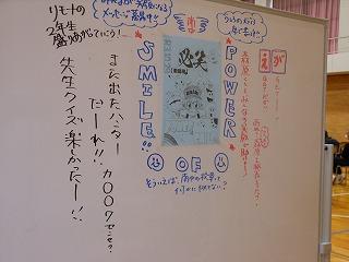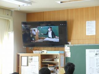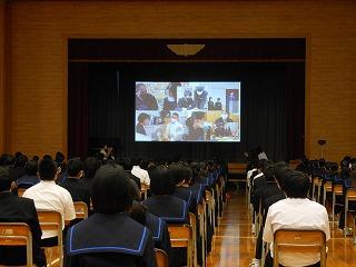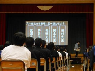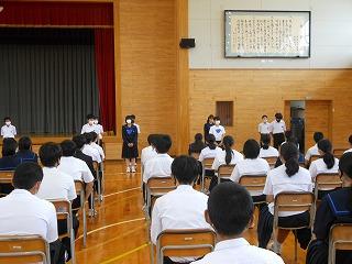 各学年の発表に続いて、有志によるステージ発表と吹奏楽部演奏でした。有志は2組、1組目は3年生4人組、素敵な歌声を体育館に響かせました。2組目は先生方4人組の先生クイズ。先生方のいろいろな面を知ることができました。全校が教室に戻り、最後は吹奏楽部が録画した演奏3曲をモニタで視聴しました。