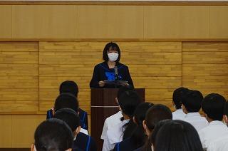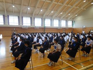 昨日の金沢自主プランを終え、2年生の時間割は学年の時間としました。昨日の活動の振り返りとともに、3限目には体育館で集会を行い、前・後期学年プロ委の皆さんの挨拶に続いて、学年主任の吉田先生から今後に向けての話、他の先生方から学習面と進路面の話がありました。
