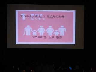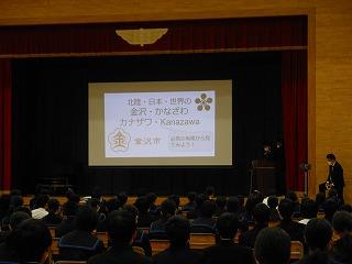 オープニングに続いて、各学年の総合的な学習の時間のステージ発表がありました。1年生は津幡町について寸劇を入れながらの発表、2年生はクイズをいれながら中核都市・金沢市について発表しました。3年生はこれまでの学習を受けて、次世代として自分たちができることについて発表しました。どの発表も学年の代表にふさわしいものでした。