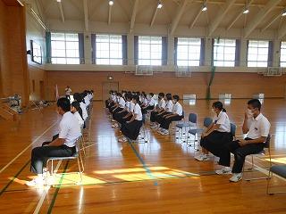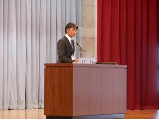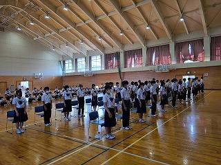 表彰伝達、生徒会任命式後に通常の集会に移りました。永井校長先生のお話に続き、茶谷先生の生活面のお話、岡本先生の学習面のお話、最後に生徒会タイムで渡邉文化委員長の呼びかけと松村生徒会長による学校祭スローガンの発表がありました。