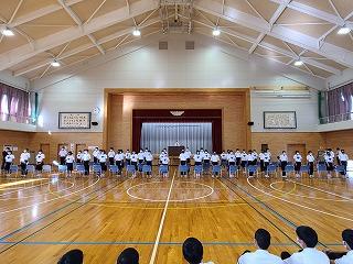 今日の6限目は、10月の全校集会と後期生徒会任命式を行いました。表彰披露の生徒と生徒会役員・学年プログラム委員の生徒は体育館で、その他の生徒は教室でリモート集会としました。表彰披露は180名以上の生徒が該当し、郡市新人や加賀地区新人、各種コンクール入賞の賞状を全校生徒の前で披露しました。