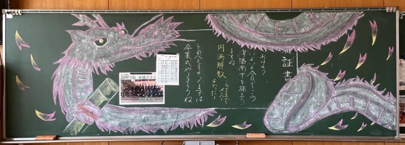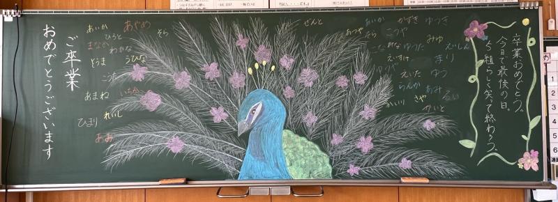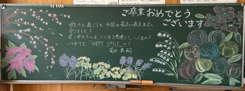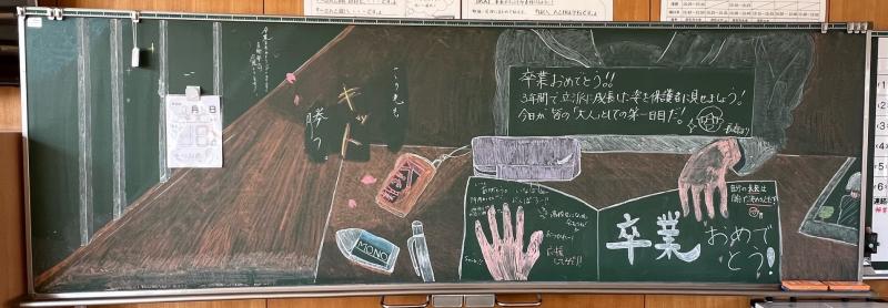 先日行われた卒業式の日、教室の黒板は、美術部の描いた黒板アートで彩られました。
