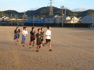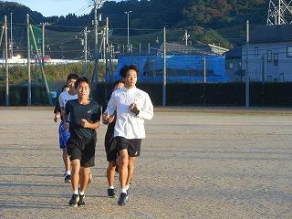 11月10日(木)に行われる県中学校駅伝大会。今日も出場メンバーがグランドで練習に取り組んでいます。今年度は男子は陸上部とボート部の混成チーム、女子は陸上部とバスケットボール部の混成チームです。顧問の田村先生が後ろからペースを作り、練習に取り組んでいます。