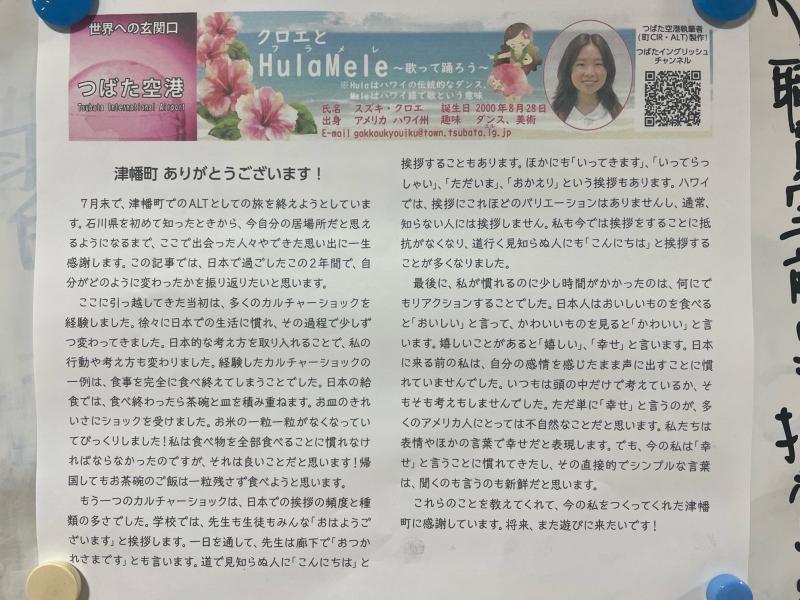 今までありがとうございました!7月の津幡町広報誌にクロエ先生の記事が載っています。