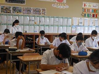 ▽2年英語「文意を読み取ろう」(英語の教育実習生が授業を参観しています)