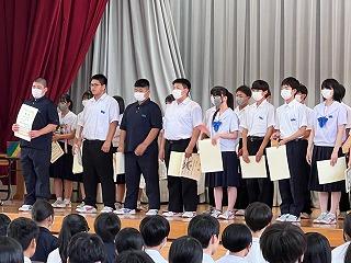 表彰披露のあと、石川県体育大会スローガンの部において、3年生の谷川瑞季さんの作品が応募総数6000余りの作品総数の中から最優秀作品に選ばれ、石川県中体連体育連盟の大茂 勝 会長より表彰されました。