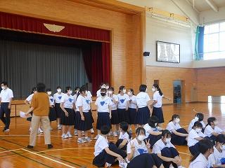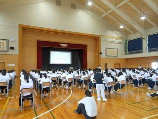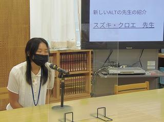 2学期始業式では、永井校長先生のお話を聞きました。続く集会では、生活面・学習面のお話と新しいALTのクロエ先生の紹介がありました。