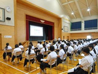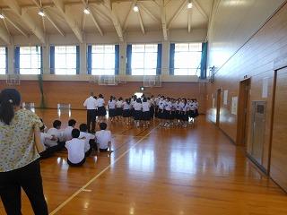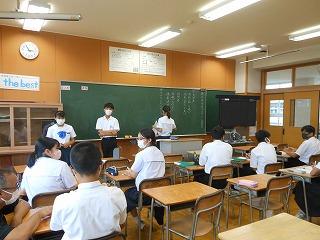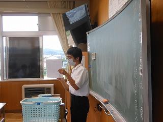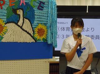 生徒会の時間には、重点委員会の体育委員会から、授業時の服装に気をつけようとの呼びかけがありました。また、美術部の皆さんが制作した運動会スローガンも披露されました。