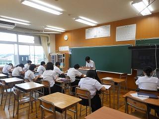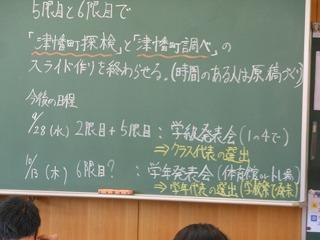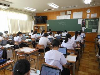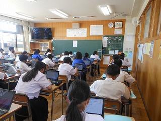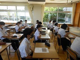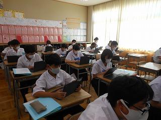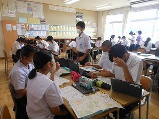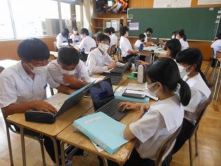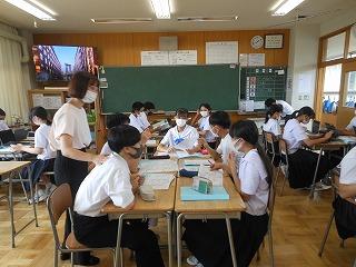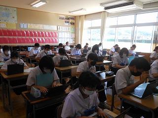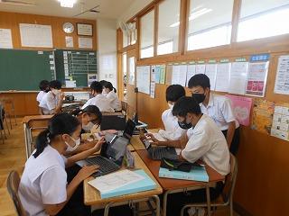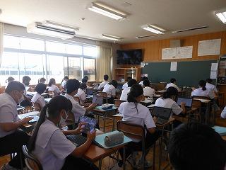 1年生は「津幡町調べ」のスライドを完成させていました。いよいよ月末から学級ごとに発表会をします。早く仕上げた生徒はスライドをもとにどのように発表するかおおまかな原稿を考えていました。