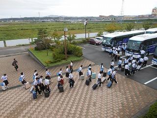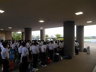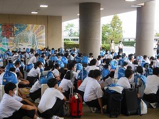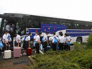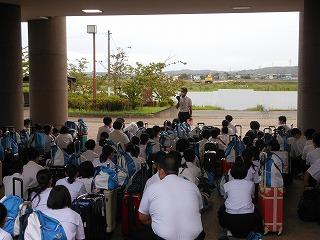 昨夜の雨も上がり、3年生は5時30分過ぎから登校しました。6時の出発式では、永井校長先生、学年プロ委の出島くんの話を聞き、荷物を積み込みました。6時30分に学校を出て、3年ぶりとなる修学旅行がスタートしました。