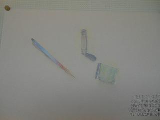 美術室前の掲示板に1年生の最初の作品「見つめ感じ取り描く」が飾られています。