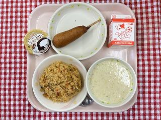 今日の給食はドラマ「おいしい給食」のメニューでした。ただいまシーズン2を放映していますが、「アメリカン給食」として、ジャンバラヤ、アメリカンドック、コーンスープ、デザート(コーヒーゼリー)をいただきました。