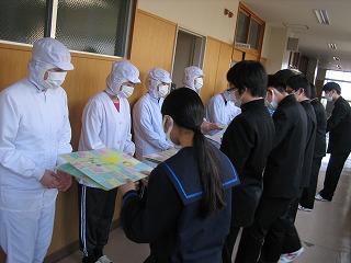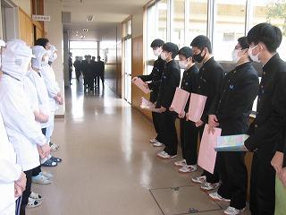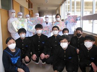2月の給食委員会では、安心安全で毎日おいしい給食を作ってくださる調理員さんへのメッセージを送る取り組みを企画しました。今日の昼休みに代表の生徒が調理員さんにお渡ししました。一人ひとりの丁寧なメッセージに調理員さんたちも喜んでくれました。