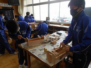 2学期末から3学期の技術は木材加工を学習しました。学習の成果として作品づくりを行い、本棚やティッシュケースなどが完成しました。月末には自宅に持ち帰ります。自分の部屋やリビングで使ってみてもいいですね。