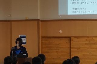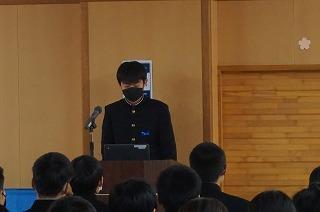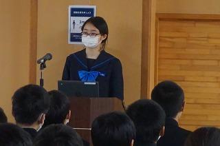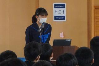 1年生は昨日1・2限に卓球場で学年集会を行いました。1限目は3学期に総合的な学習の時間で取り組んだ職業調べの学年発表会です。各クラスの代表生徒12人が図書館司書や獣医、歯科医師など、各自がまとめたスライドをChromebookで発表しました。
