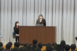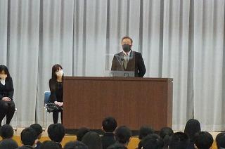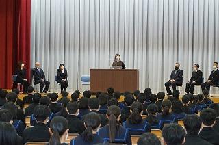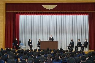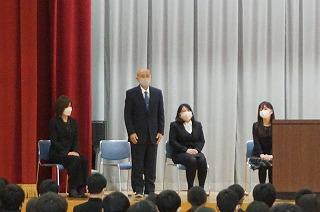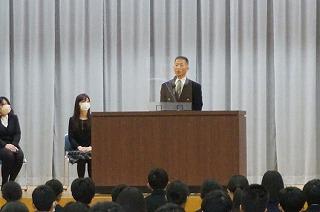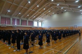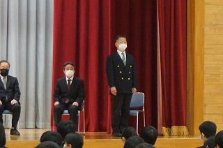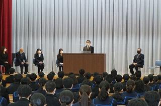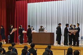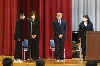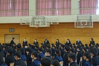 給食をはさんだ午後に、令和3年度離任式を行いました。昼休み後の予鈴で離任・退任する先生方を知り、びっくりした生徒もいましたが、気持ちを切り替えて、厳粛な雰囲気で式に臨みました。先生方のお言葉に続いて、生徒代表の林玲旺くんがお別れの言葉を述べ、久しぶりの校歌斉唱と大きな拍手で7名の先生方をお送りしました。