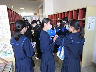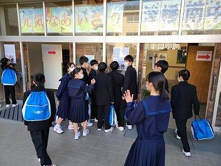 今日は朝、やや大きめの制服を身に着けた新入生が初めて登校しました。玄関で自分のクラスを確認し、3年生の生徒会執行部・委員長14名の誘導のもと、教室に入りました。学級担任の先生と顔を合わせ、学級開きの後、体育館で式練習に入りました。明日は午後から入学式を行います。