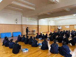 自転車通学をする生徒は卓球場で「交通安全」を確認しました。