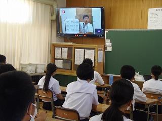 今日で70日間の1学期も終了。大掃除の後にリモート集会を行いました。通信陸上や県大会の表彰披露に続いて、終業式では永井校長先生の1学期を締めくくる訓示を聞きました。夏休みに向けての集会では、生活面と学習面での心がけを確認し、最後にALTのジョナサン先生の離任式。ジョナサン先生の離任の挨拶に続いて、柳谷内生徒会長が英語でお礼の言葉を堂々と述べました。