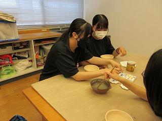 美術部の皆さんは夏休み期間中の活動として、シグナスでの陶芸教室に参加しています。10日は地域の皆様のご指導を受け、釉掛けを行いました。いよいよ本焼、17日(今日)の窯出しが楽しみですね。