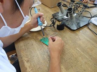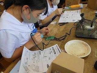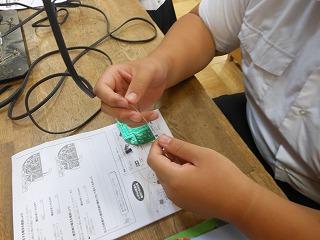 3年生の技術では、エネルギー変換のまとめとして、「スピーカー」の制作を行っています。回路のモデル図を確認しながら、間違えないように気をつけながら、はんだづけの作業に取り組んでいます。