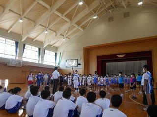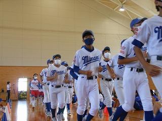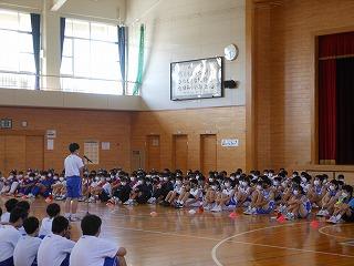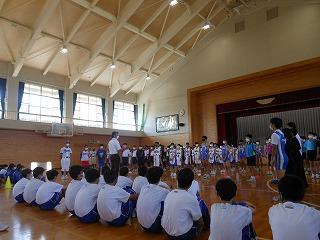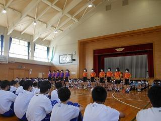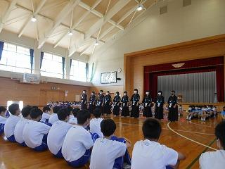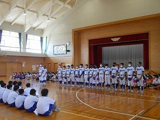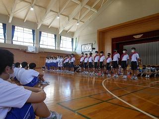 今日は午後から壮行会を行いました。先日終わった水泳競技を除く河北郡市中学校新人体育大会に出場する部活動と加賀地区中学校新人相撲大会に出場する相撲部の皆さんを激励する壮行会です。全日本吹奏楽コンクールに出場する吹奏楽部の演奏で、新チームの皆さんが入場し、新キャプテンが抱負を述べ、その後全校生徒のエールを受けました。選手宣誓は野球部の高磯空汰くん、永井校長先生の激励の言葉、生徒会代表の杉浦大也くんの激励の言葉に続き、サプライズのプレゼント!家庭部の皆さんが作ったお守りつきの手指消毒ボトルです。手作りの必勝お守りを持って各部は大会に挑みます。最後に女子バスケットボール部の飯田紗々羽さんのお礼の言葉で締めくくりました。