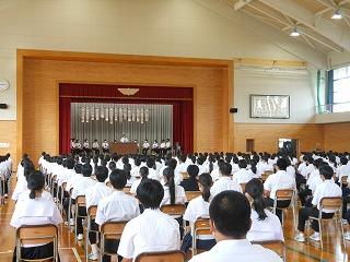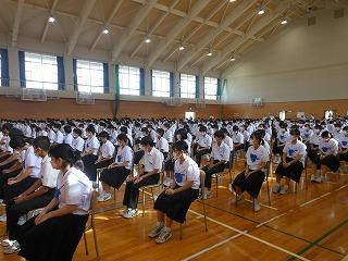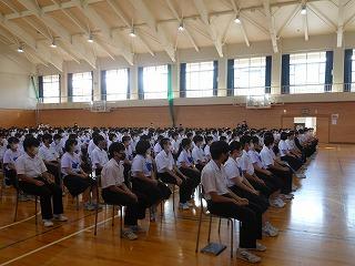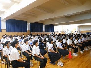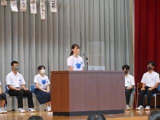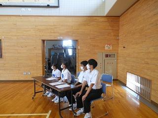 5限の学活後に、先に清掃を行い、6限は2・3年生が体育館に、1年生が卓球場に集合し、後期生徒会役員選挙立候補者立会演説会を行いました。初めてステージに立つ立候補者もいましたが、緊張しながらも堂々と役員・委員長として頑張りたいことを全校生徒に訴えていました。