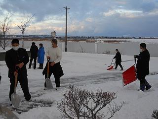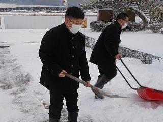 気温は低かったものの、大雪にはならず、本日を迎えました。学校前も数センチ程度の雪でしたが、登校した相撲部やボート部の部員が除雪活動に協力してくれました。