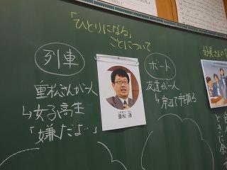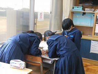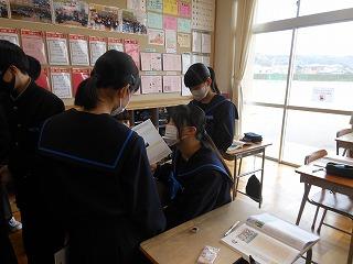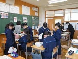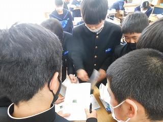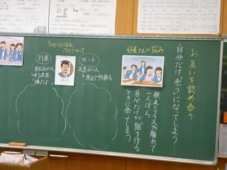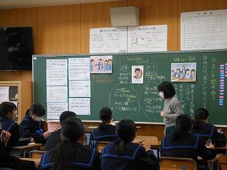 1年3組では主題「お互いを認め合う」について「自分だけ余りになってしまう」を題材に考えました。好美さんが一人になってしまう状況に悩んでいることを受けて、重松清さんが自身の体験談などを交えながら答えていく教材を通して、重松さんが一人になることについてどんな捉え方をしているのかや余りの一人を分かち合うとはどういうことかについて考えを深めていました。