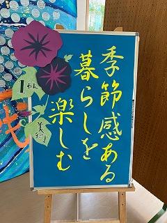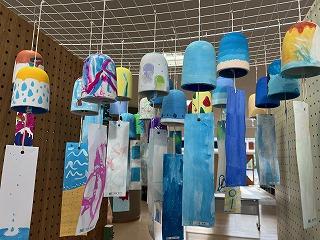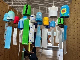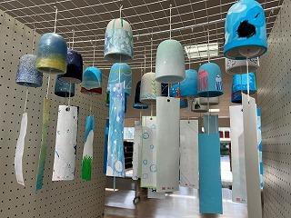 暑い日が続きますが、生徒玄関ピロティには、1年生が美術で制作した風鈴が飾られました。