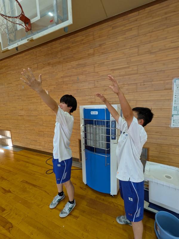 南中では暑さ対策として、6月下旬から体育の時間のシャツ出しを解禁しています。また、体育館に水筒持参で水分補給もしっかり行っています。また、大型冷風機や扇風機を稼働させています。けれどやっぱり暑いです。体育館にクーラー付かないかな~・・・。