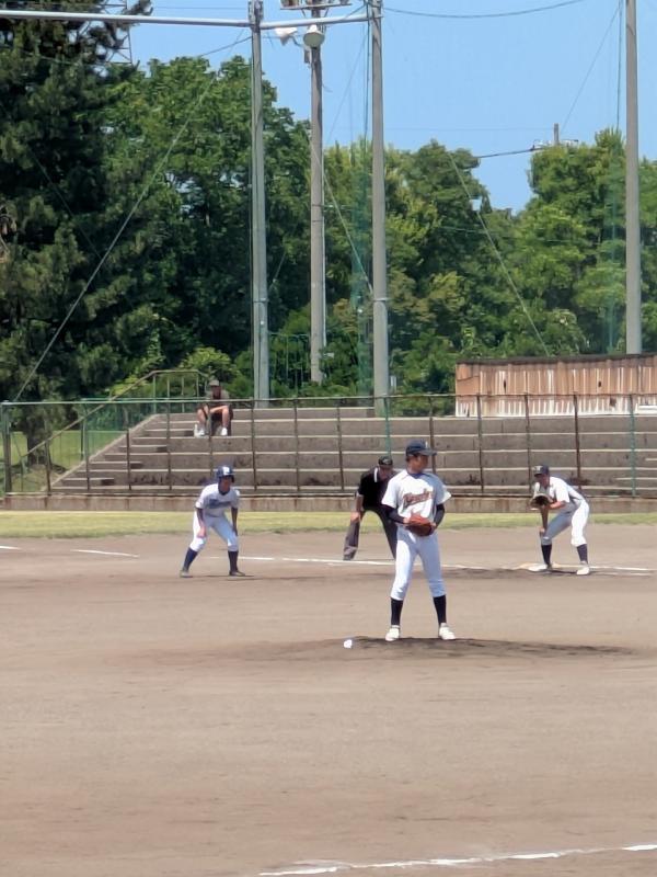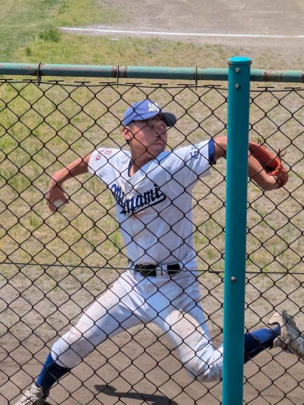 初回、いきなり先頭バッターにヒット。その後バントで送られ、4番バッターに先制となるヒットを打たれ1点を取られました。エースピッチャーの木下さんの球は走っているように見えましたが、さすが相手もここまで勝ち上がってきているチームです。しかし、南中も黙ってはいません。1回裏、1番の坂田さんがセンターオーバーの3塁打。続く2年生の表さんもセンターオーバーの2塁打。あっという間に同点です。その後お互いに点を取り合い、一進一退の攻防が続きます。次の1点をどちらが取るかが勝敗の分かれ目でした。ここで南中ナインの機動力が相手をかく乱しました。フォアボールや盗塁、相手のミスもからみ7回表に追加点を奪い勝負あり。100球近く投げ込んだエースの木下さんは、最後まで球威が衰えることなく、1人で7回を投げ切りました。