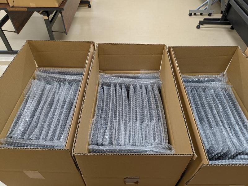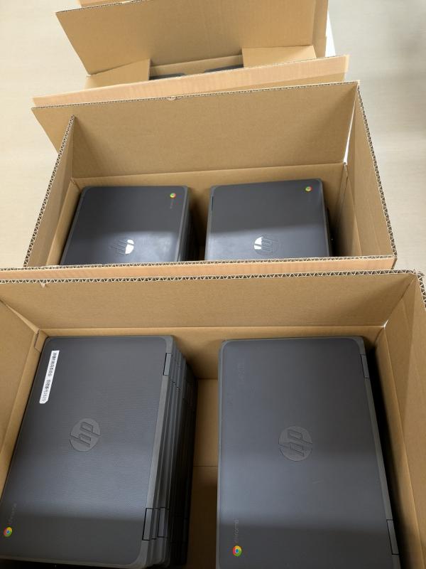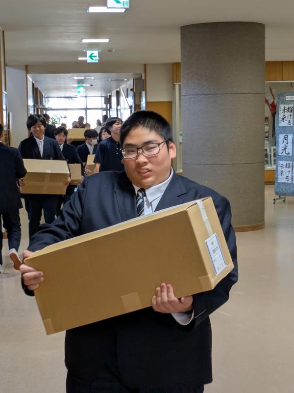 それはさて置き、今日は前に使っていたChromebookを運び出す作業を行いました。昼の放送で、「相撲部のみんなと、我こそは力自慢と思う生徒は、1階の会議室に集まってください。」と言ったところ、たくさんの力自慢たちが集まってくれました。Chromebookは1台約1.3キロあります。一箱に20台入っているので約26キロあります。たくさん集まってくれたおかげで、作業はあっという間に終わりました。