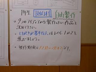1年の技術科では、木材加工の基礎技術を習得し、いよいよ今月から制作に入ります。技術室前には9つの作品からどれを選んで制作するか拡大掲示がされています。レベル1~3の3段階に分かれており、各自が設計図をもとにしながら選択していきます。