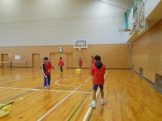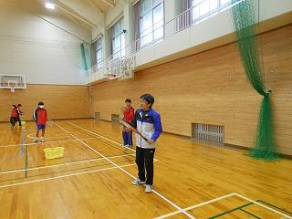 午後からは男子ソフトテニス部のみが体育館で練習をしています。顧問の先生の指導を受けながら、正確にボールをとらえて打つをテーマに取り組んでいました。