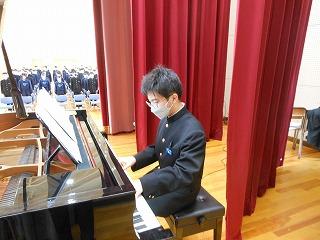 校歌の伴奏は2年生の櫻井章翔くんです。