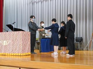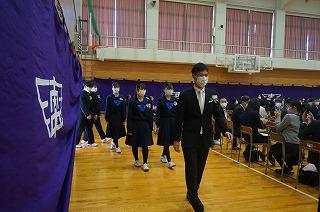 給食をはさんだ午後に、令和3年度離任式を行いました。昼休み後の予鈴で離任・退任する先生方を知り、びっくりした生徒もいましたが、気持ちを切り替えて、厳粛な雰囲気で式に臨みました。先生方のお言葉に続いて、生徒代表の林玲旺くんがお別れの言葉を述べ、久しぶりの校歌斉唱と大きな拍手で7名の先生方をお送りしました。