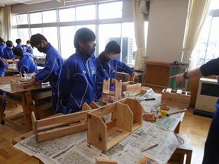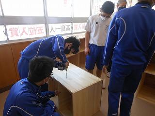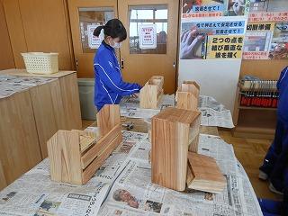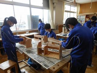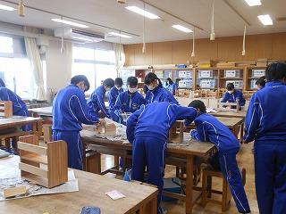 2学期末から3学期の技術は木材加工を学習しました。学習の成果として作品づくりを行い、本棚やティッシュケースなどが完成しました。月末には自宅に持ち帰ります。自分の部屋やリビングで使ってみてもいいですね。