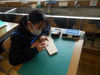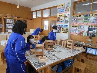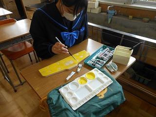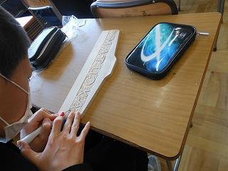 美術の木彫りハンガーも残り2時間程度で完成。生徒たちは時間を有効に使って黙々と作業をしています。彫り終えて、色付けまで進んでいる生徒もいます。